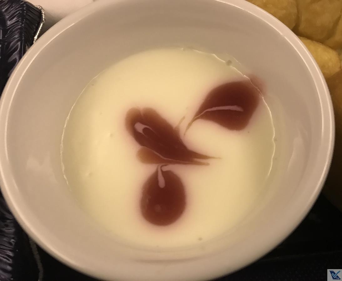 – eram 02:30h quando a cabine começou a ser preparada para o “segundo” serviço de bordo; a minha vez chegou 15 minutos depois; a apresentação da bandeja era perfeita, com alguns detalhes diferenciados: a flor “desenhada” no iogurte e o corte das frutas; a quiche de pato estava deliciosa; os talheres eram de aço inox, com a logomarca da companhia japonesa; suco de laranja e café preto acompanharam este “banquete”; faltou um único detalhe para que esta refeição fosse perfeita: o croissant poderia ter sido servido quente