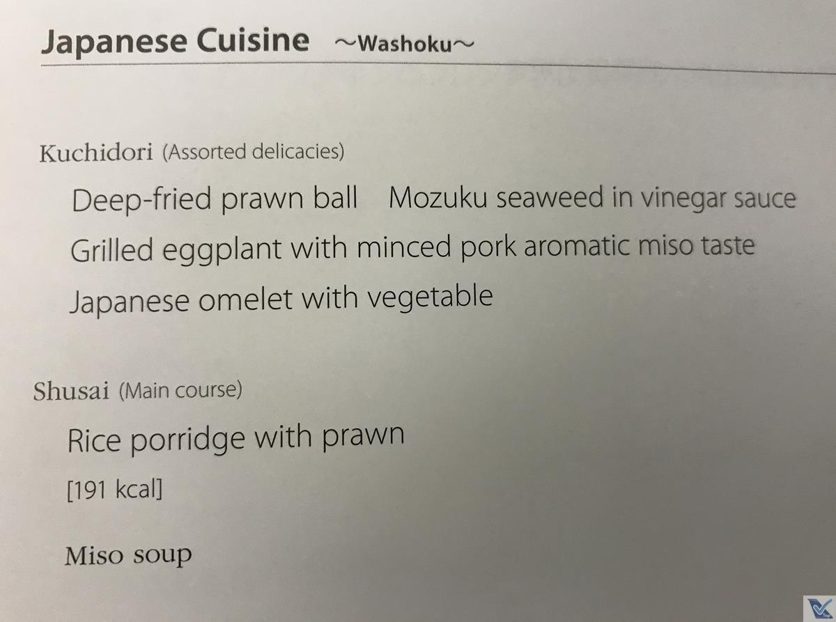 – não foi oferecido welcome drink nem snacks antes da partida; somente uma garrafa de água foi distribuída aos passageiros, junto com o Menu (a ANA fez um único para os voos de ida e volta desta rota, as opções estão identificadas por abas, de acordo com o sentido do voo), onde opções de jantar de cozinha “japonesa” e “internacional” estavam destalhadas; um cartão para indicar a opção de refeição que seria servida mais próxima do pouso também foi entregue