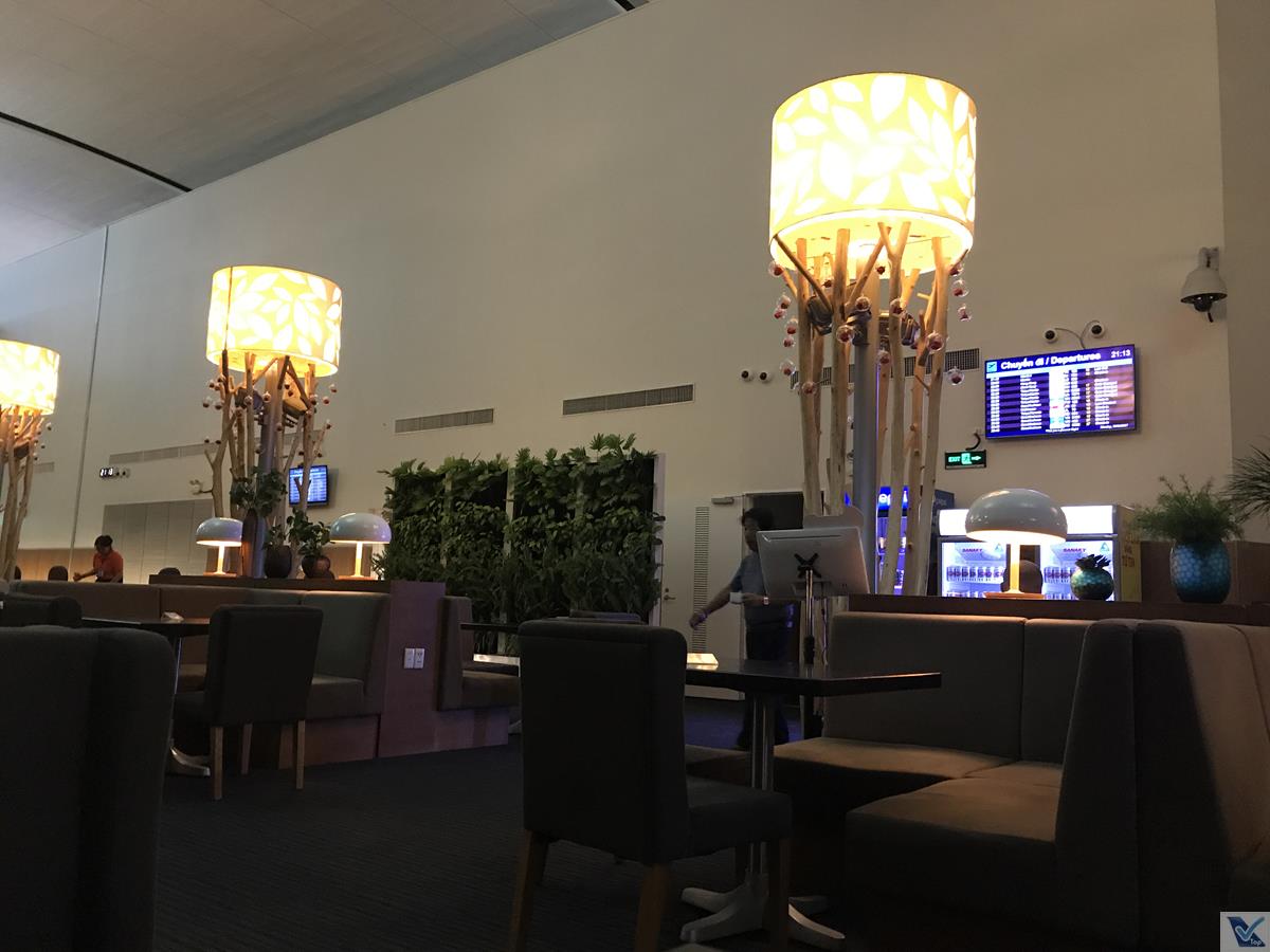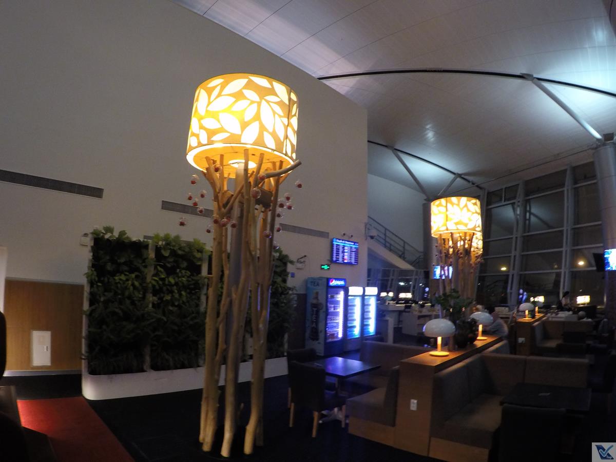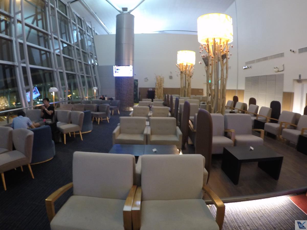 – a decoração deste Lounge tem estilo mais clássico, com grandes luminárias com estrutura de madeira parecendo bambus; as poltronas tinha tecido bege claro e azul, todas novas e bem cuidadas; as janelas de vidro permitem boa visão para o pátio, várias aeronaves estavam taxiando, mas a pouca iluminação externa não permitiu boas fotos