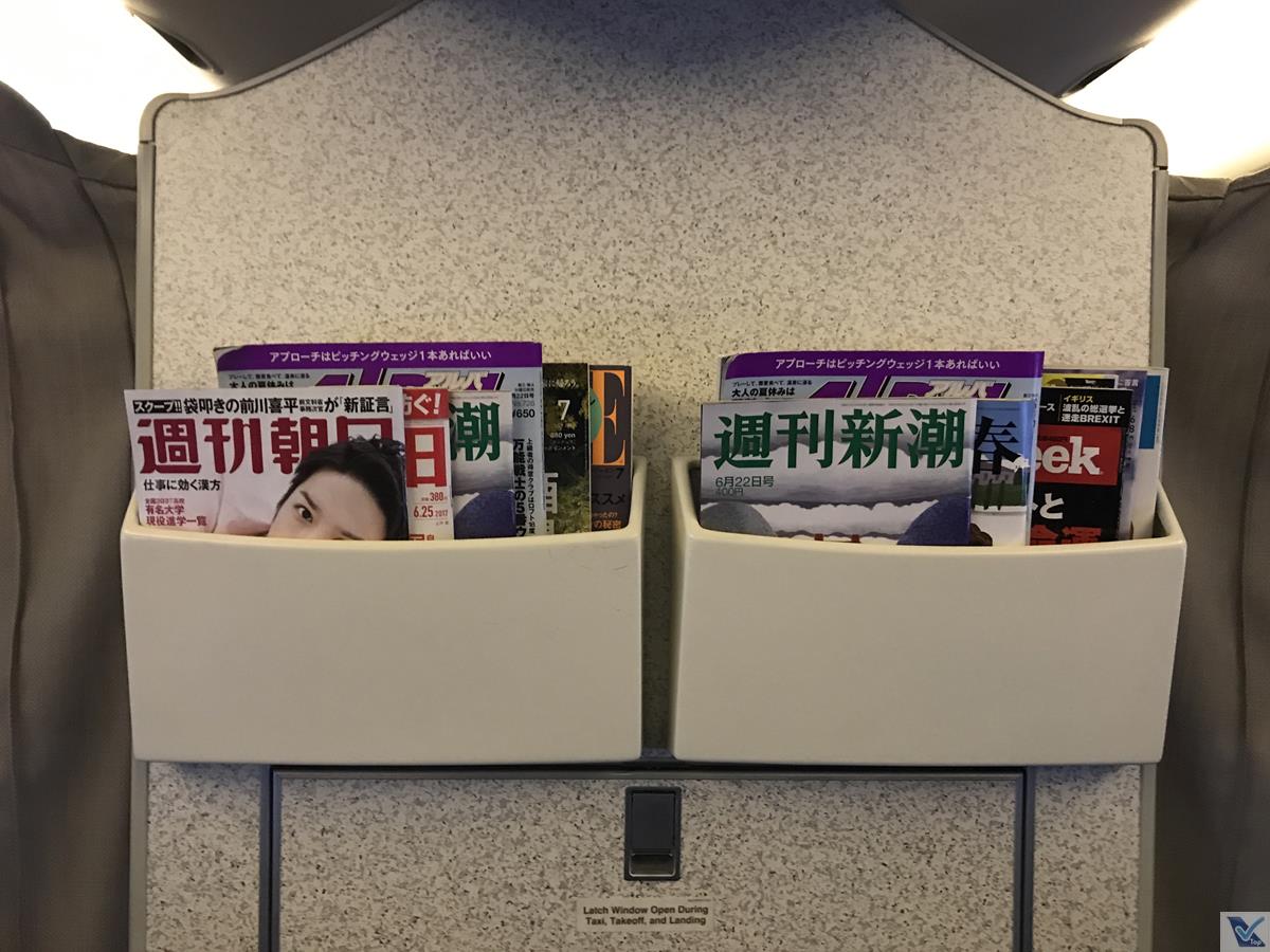 – atrás de mim, na divisória para a classe Econômica (onde a configuração era 2 x 3 x 2), algumas revistas estavam disponíveis; uma cortina separa as 02 cabines