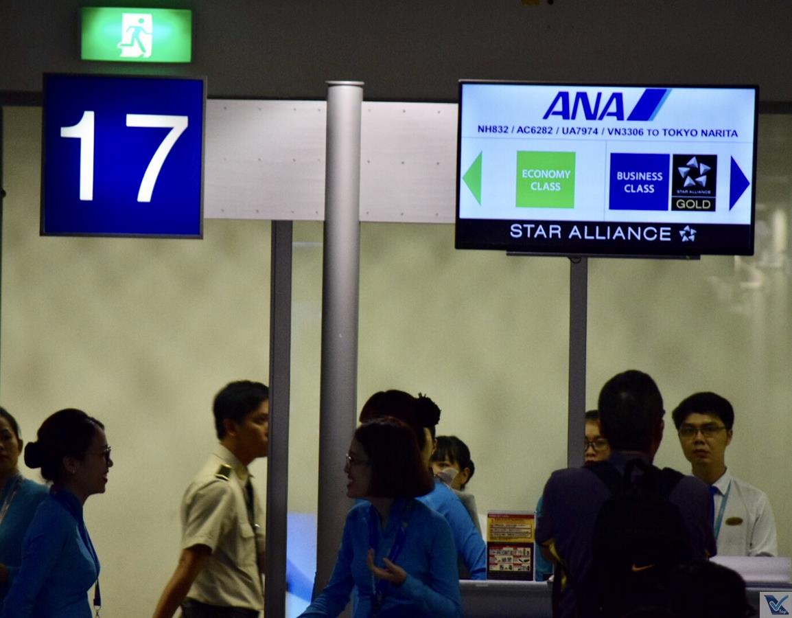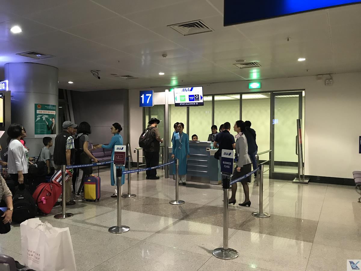 – o atendimento foi ótimo e atencioso, mas demorou um pouco para que a funcionária conferisse o meu passaporte e os vistos necessários para saída do Vietnã e entrada no Japão (por mais que eu fosse ficar apenas algumas horas por lá, fazendo conexão); ela me entregou um voucher para permitir meu acesso à Sala VIP terceirizada que a ANA utiliza neste aeroporto; por fim, me informou que o Portão 16 seria utilizado para o embarque do meu voo