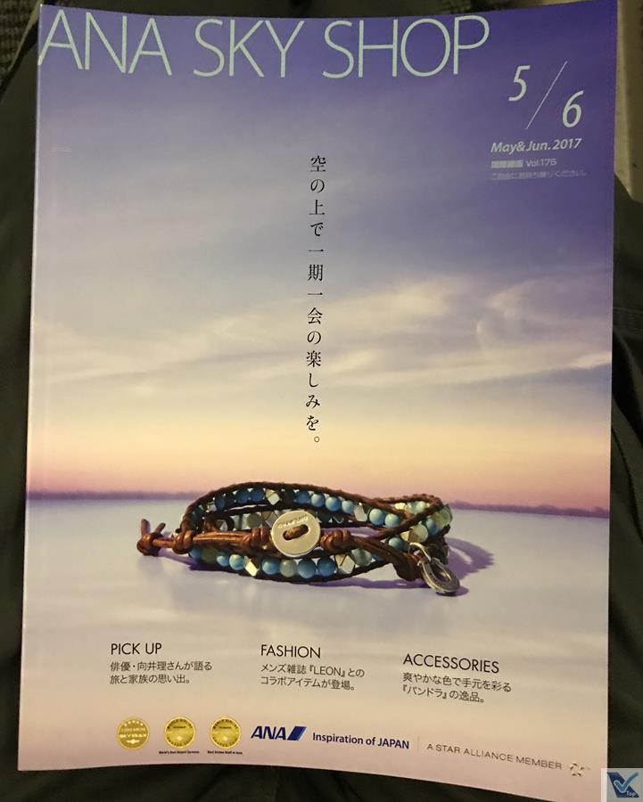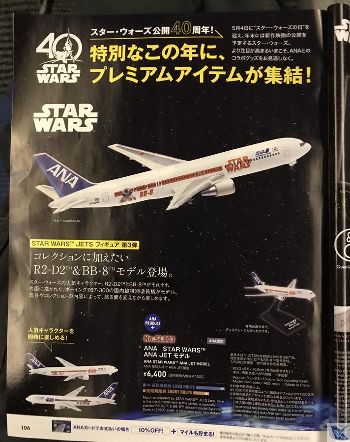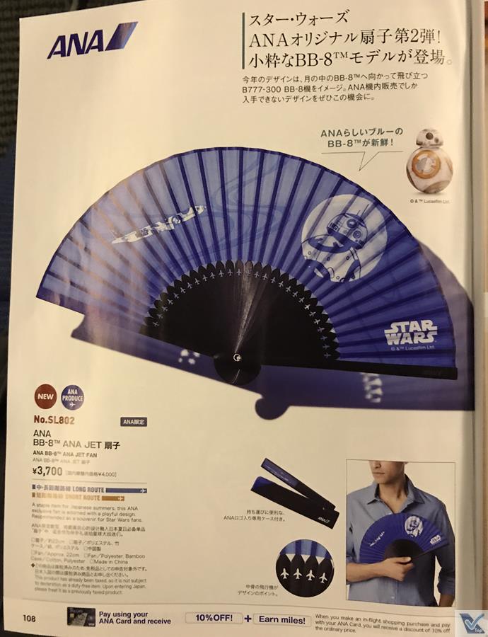 – na revista Ana Sky Shop vi que 02 souvenires da ANA estavam disponíveis: uma miniatura do B767 (escala 1/500) e uma ventarola japonesa, ambos alusivos aos 40 anos da saga Star Wars ; chamei a Comissária e informei que queria comprar; ela foi muito atenciosa e, logo depois, voltou com os produtos e a máquina para passar o cartão de crédito; a nota triste é que eu simplesmente perdi estas 02 preciosidades durante o resto da viagem…que raiva!