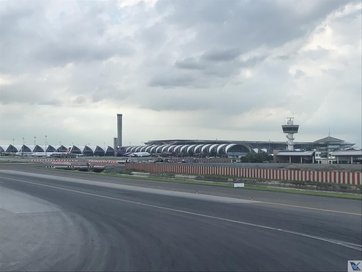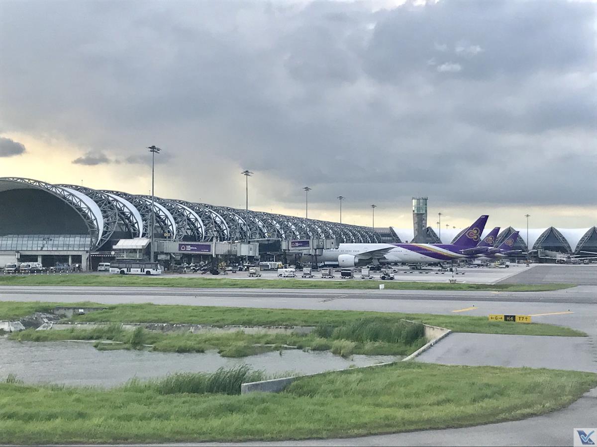 – no caminho até o terminal, é possível observar a grande quantidade de aeronaves nas cores da THAI e o design “exótico” do Aeroporto Internacional de Suvarnabhumi