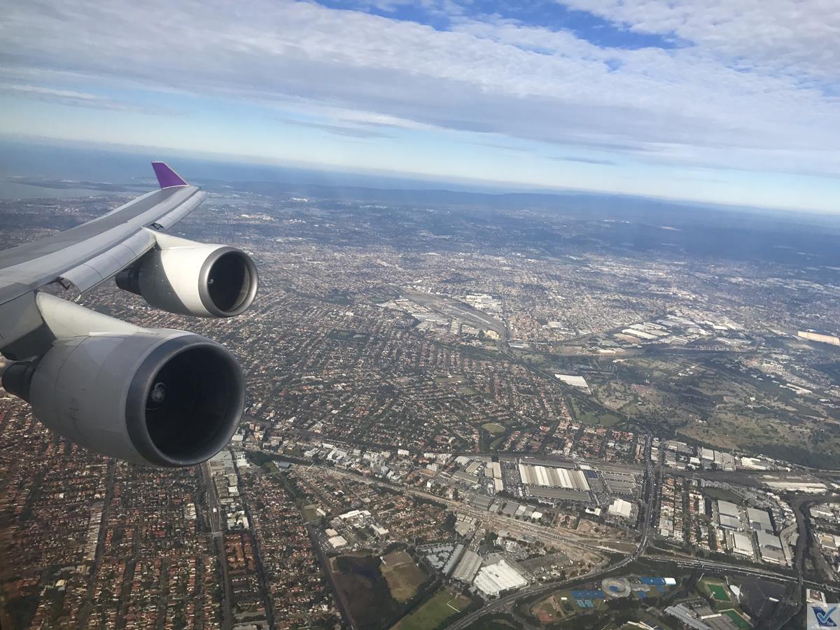 – o meu lugar permitia uma ótima visão da janela com os 02 motores instalados na asa esquerda trabalhando nesta parte inicial do voo, tendo como pano de fundo a zona metropolitana de Sydney