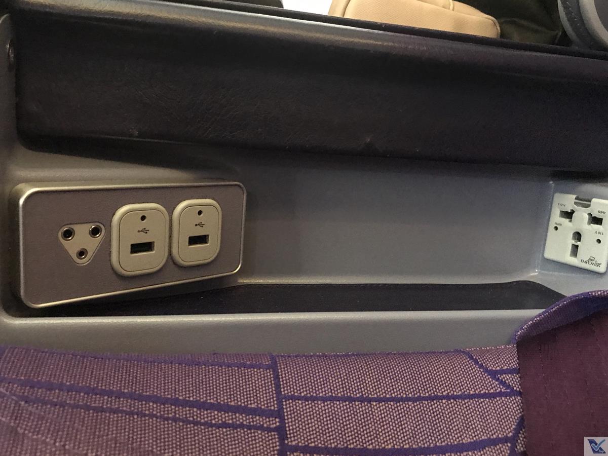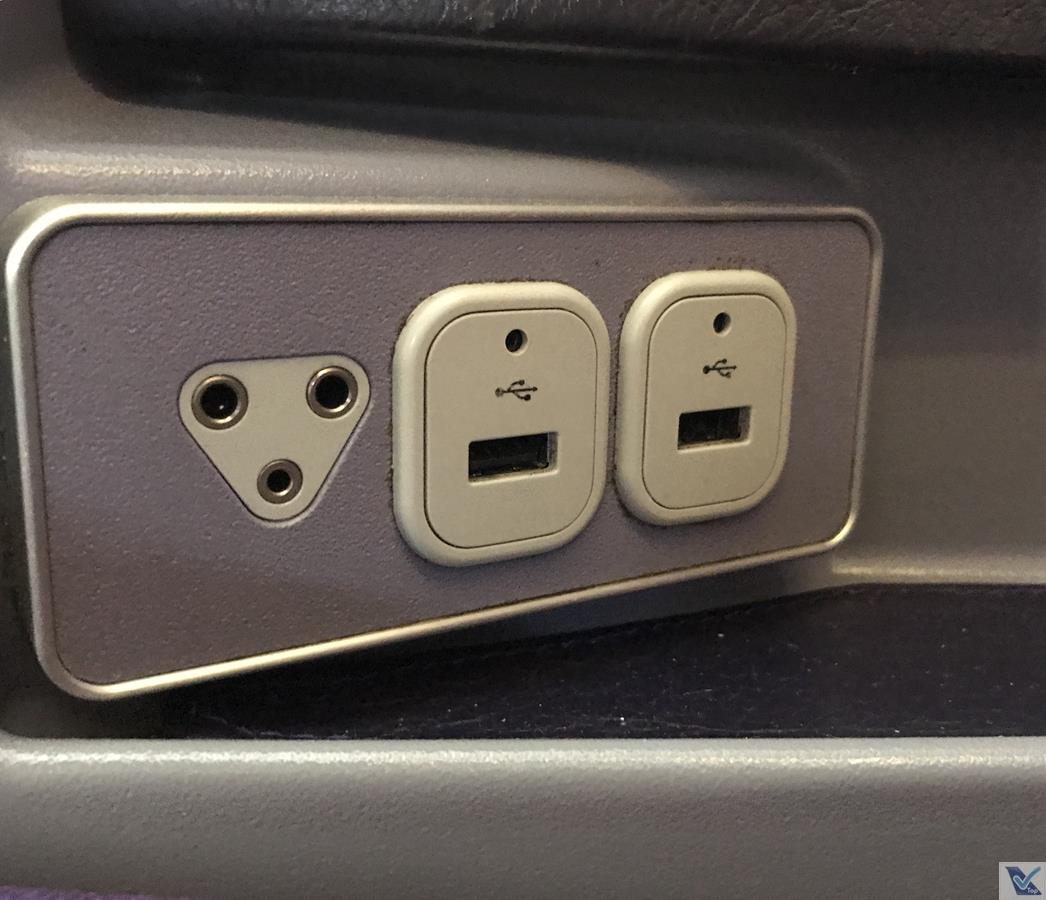 – o travesseiro, cobertor, fone de ouvido e a necessaire (marrom, da FURLA, uma marca italiana – gostei, eu tinha ganho uma azul no voo de Narita para Bangkok, mais uma para a coleção) estavam dispostos em cima do meu assento, que tem tem 02 portas USB e 01 tomada universal que estão instaladas em boa posição (no braço central da poltrona)
