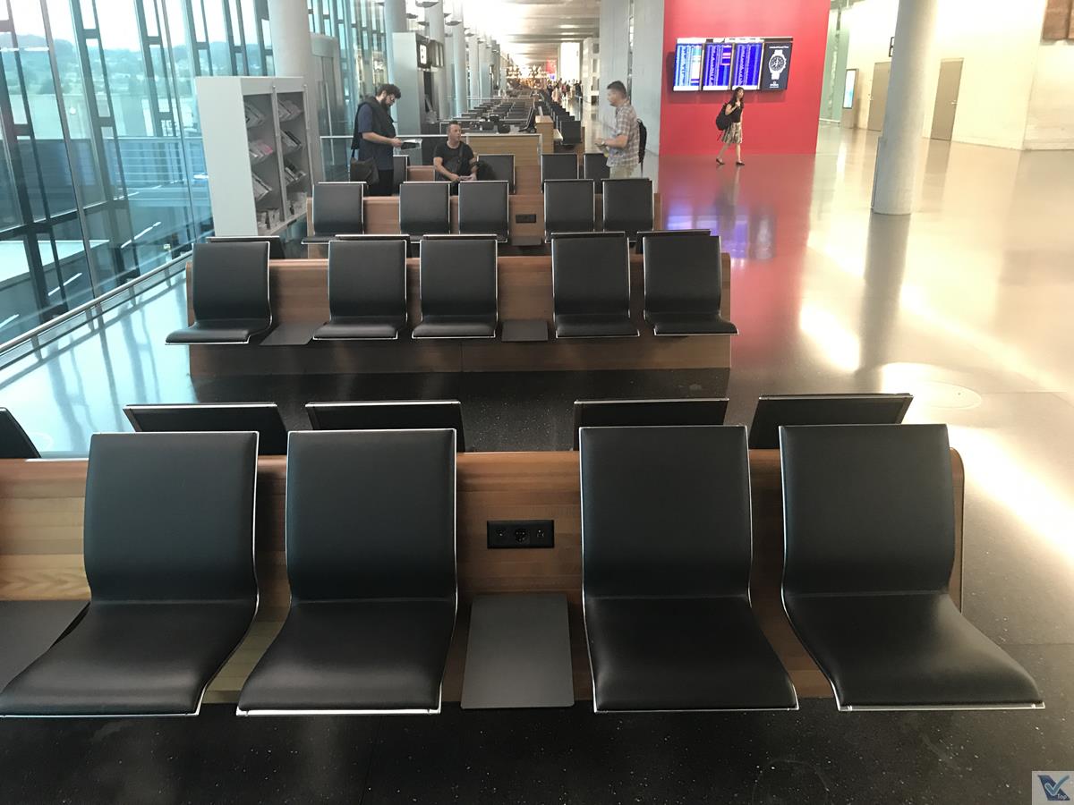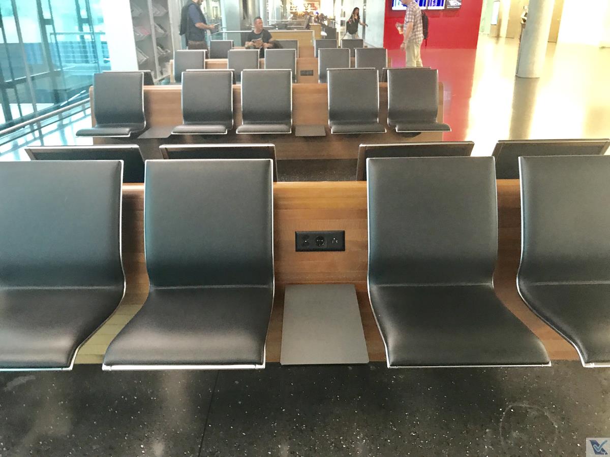 – perto de cada portão, várias estilosas poltronas estão instaladas; na estrutura delas, há tomadas para carregar equipamentos eletrônicos; grandes janelas de vidro permitem uma ampla visão para o pátio de manobras do aeroporto