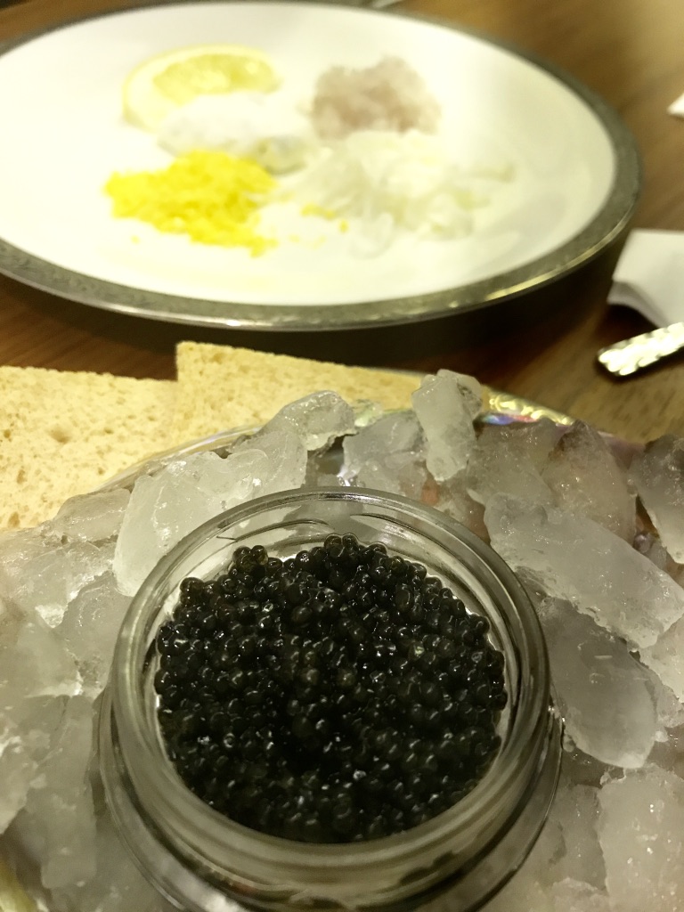 – a 1ª entrada (isso mesmo, foram mais de uma) do jantar eram 02 espetinhos de lagosta e caviar, que foi servido com 04 acompanhamentos; eu nunca tinha comido esta famosa ova de peixe, por isso não arrisquei e experimentei junto com o sal grosso e o creme de ervas; gostei, mas não compraria para comer em casa…
