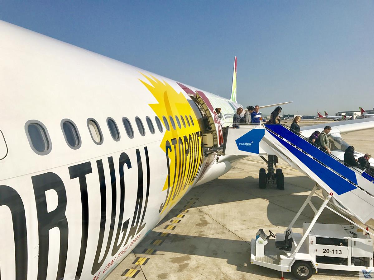 – os passageiros da classe Executiva são orientados a sair pela porta dianteira 1L (os demais passageiros desembarcam pela 2L); bem perto da escada, um ônibus exclusivo está posicionado para receber a todos; uma ótima oportunidade para tirar fotos do colorido A330 da TAP