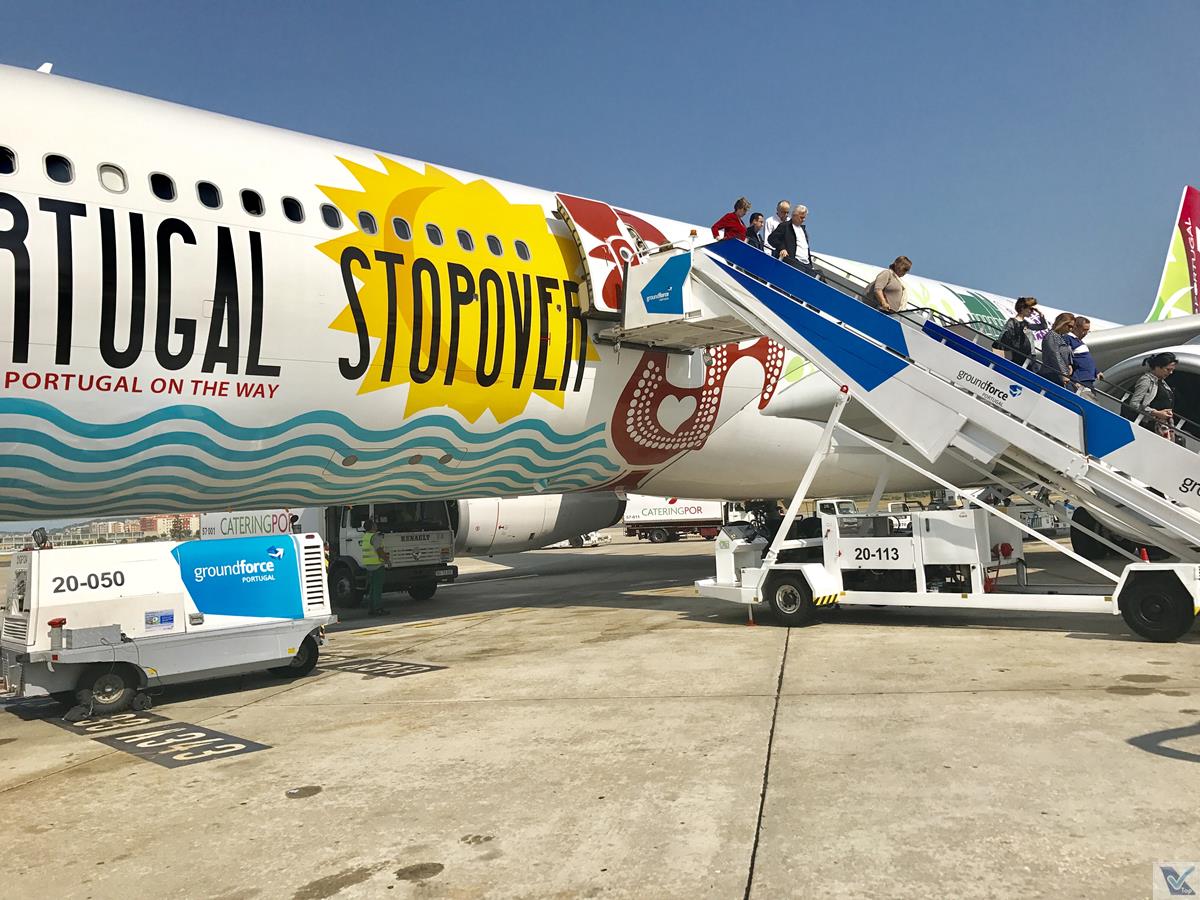– uma Comissária usou o sistema de áudio para fazer um longo discurso de promoção do “Stopover”, justamente o tema da pintura especial do A330 que me levava até Portugal: a TAP oferece a opção de “quebra” da passagem de forma que os passageiros podem ficar 01, 02, ou 03 noites em Lisboa ou Porto