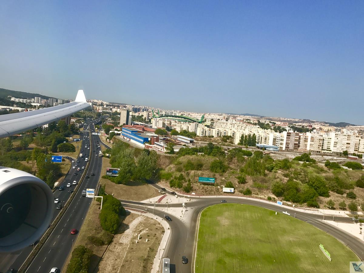 – o procedimento de aproximação foi muito tranquilo, o tempo estava ótimo nos arredores de Lisboa; a aproximação trouxe mais belas paisagens pela janela; depois de 07 horas sobrevoando o Oceano Atlântico: terra à vista!