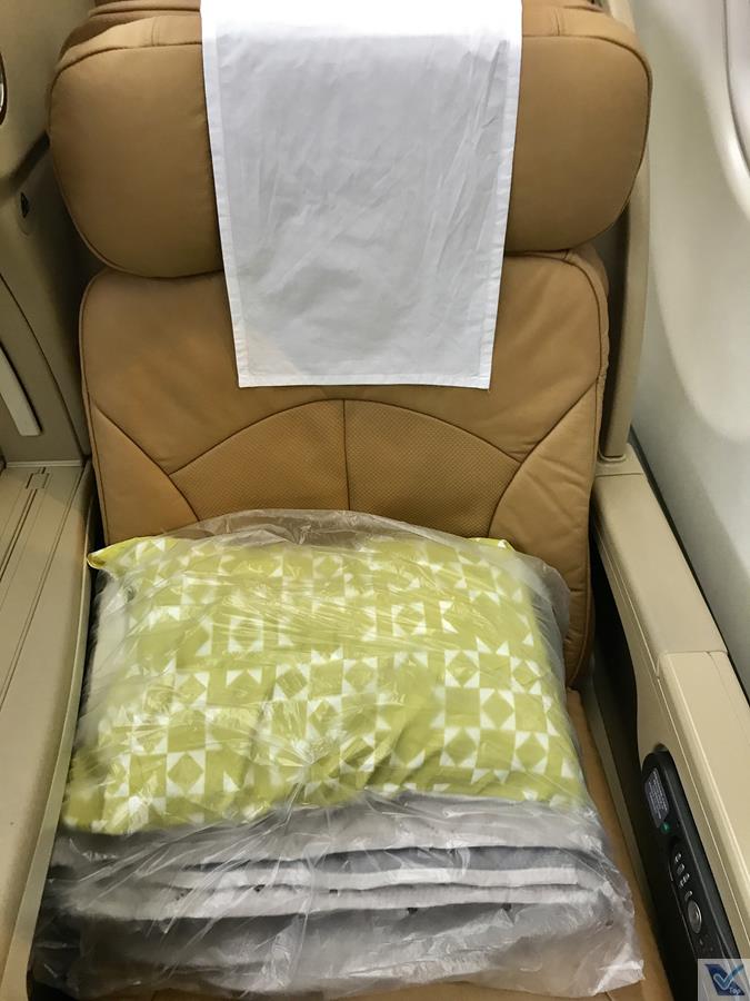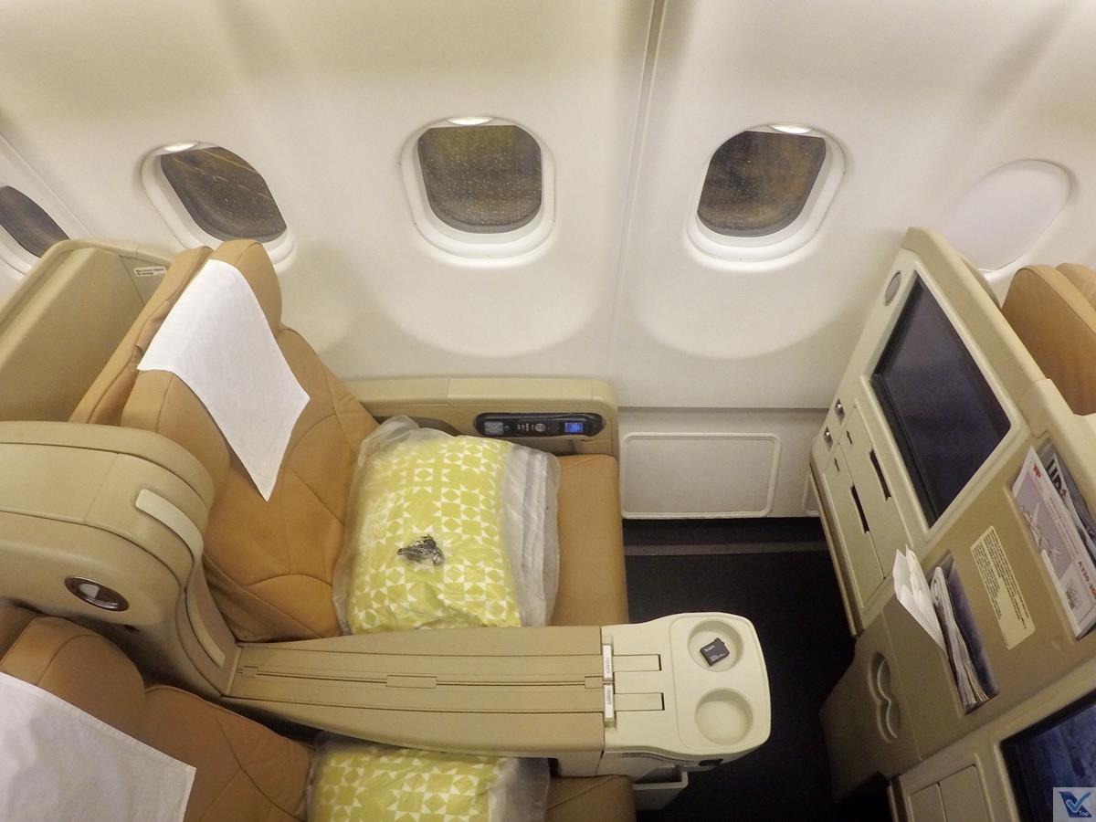 – meu assento era o 2A, uma janela do lado esquerdo da aeronave; os assentos são revestidos de couro marrom claro e o encosto de cabeça tem um protetor branco