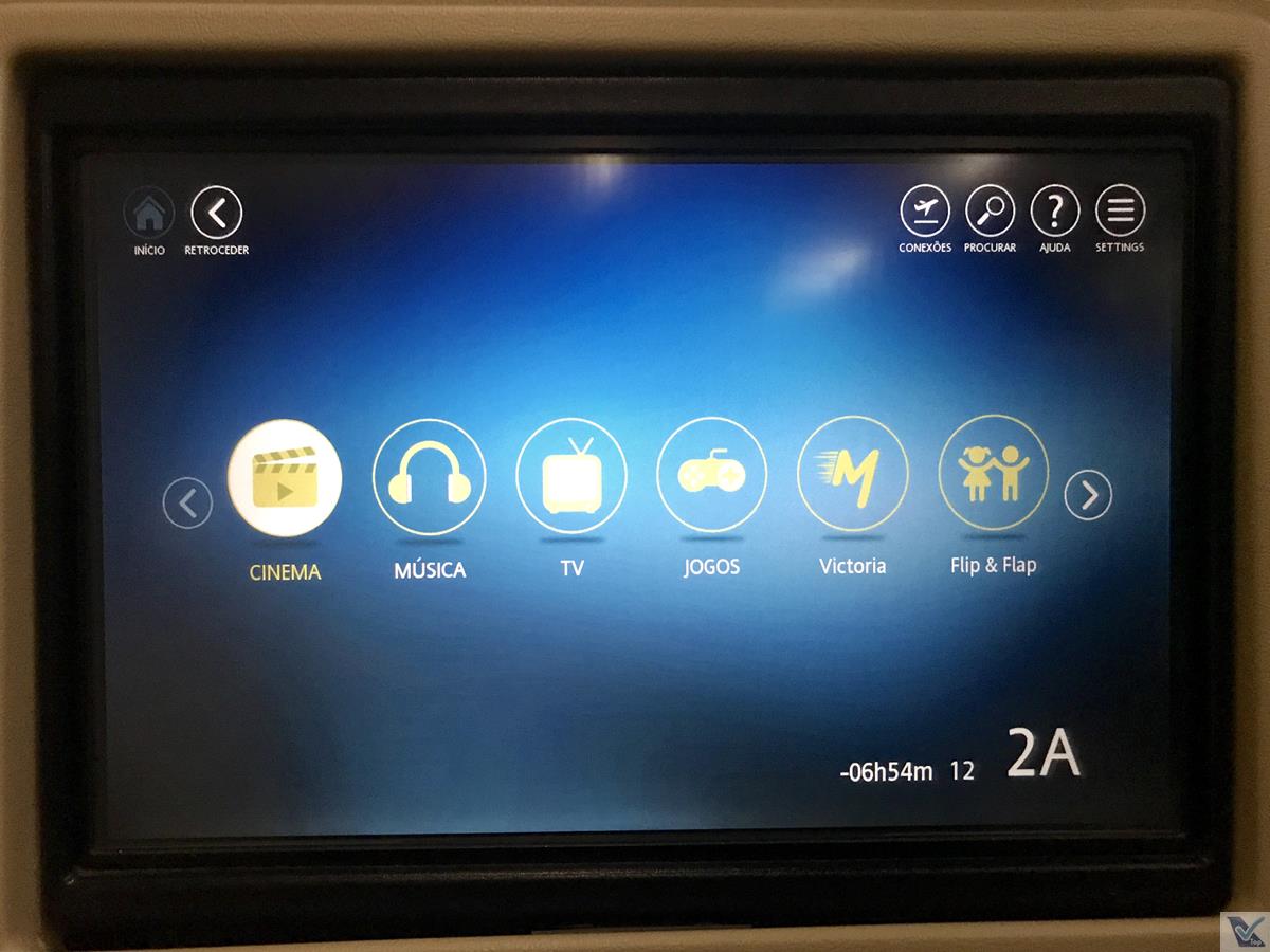 – o sistema de entretenimento não era de última geração, tinha uma tela com tamanho e resolução apenas razoável, mas sem touchscreen; a navegação no menu de opções era simples e os comandos do controle remoto funcionam bem; o fone de ouvido distribuído mais tarde era de boa qualidade, mas o som não funcionava; entendi que ele devia ser conectado nos buracos perto da tomada, testei os dois que tinham e contiuava mudo; chamei o Comissário, que confirmou que era ali mesmo que eu devia encaixar; fiquei tentanto e tentando por alguns minutos e desisti; a solução foi recorrer a filmes que tinham legendas em português