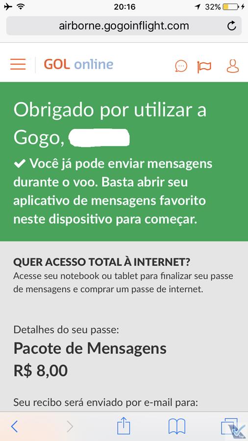 – o B737-800 da GOL tinha equipamento de wi-fi a bordo instalado e eu quis ficar conectado durante o voo; como não era a 1ª vez que eu utilizava, o acesso é ainda mais fácil, pois já tenho login e senha (e também cartão de crédito cadastrado) no sistema da GoGo, parceira tecnológica da companhia brasileira; contratei por R$ 8,00 o pacote “Mensagens”, que permite acesso às redes sociais, e-mails e aplicativos mais “leves”; neste voo, a navegação estava ruim, com um ou outro momento de uma conexão mais razoável