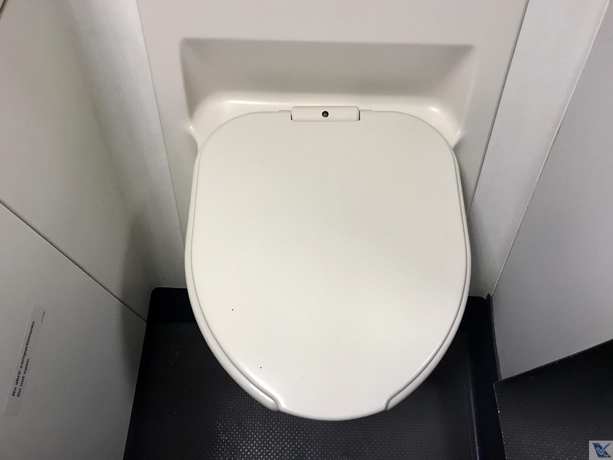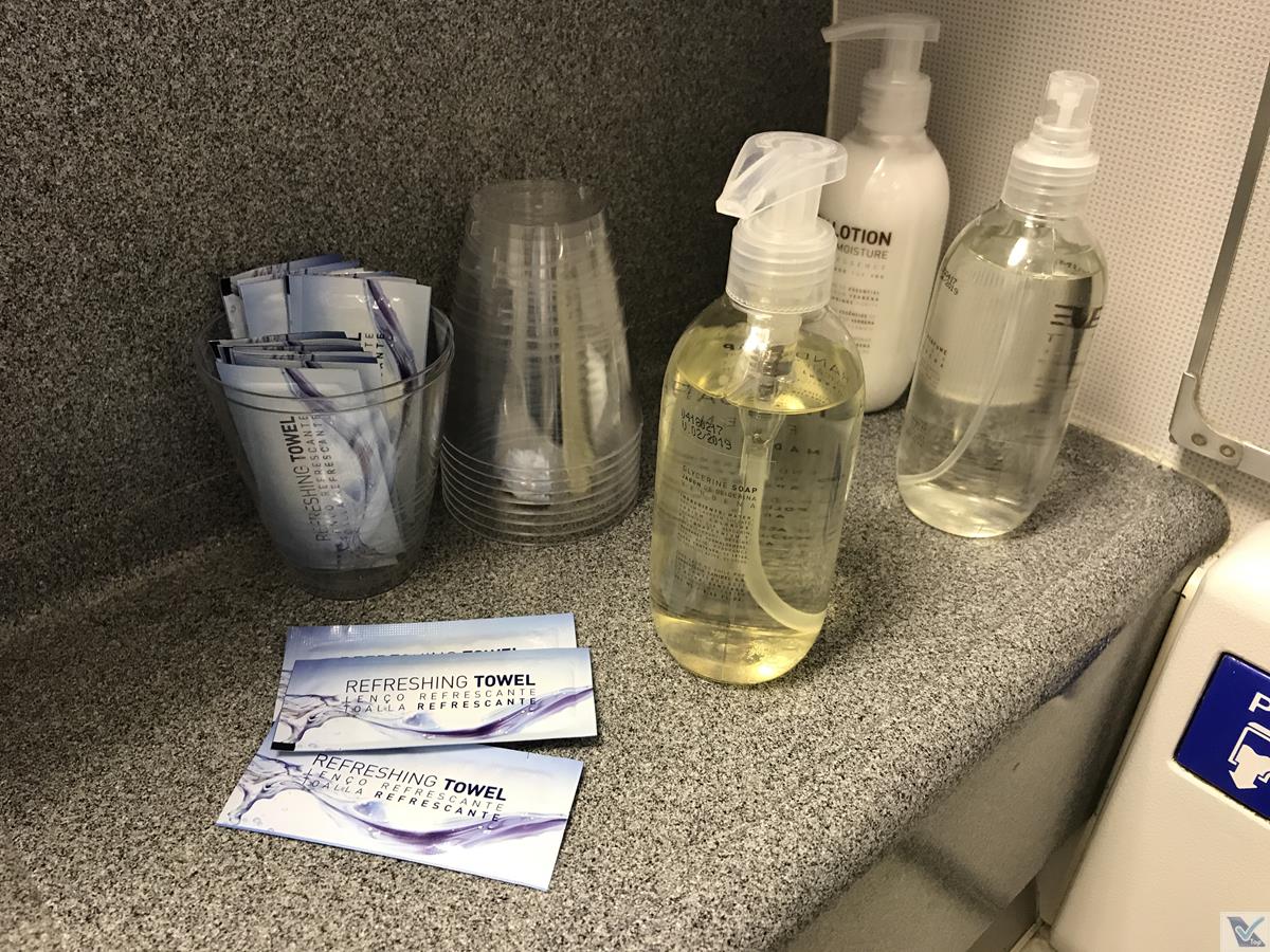 – por volta de 07:40h, fui ao banheiro; são 02 toaletes instalados na parte da frente da aeronave, mas somente 01 estava funcionando (o que fica ao lado da cabine de comando tinha uma plaquinha discreta de “fora de serviço“); achei apertado, mas estava limpo, com lencinhos umedecidos disponíveis aos passageiros (genéricos, sem a marca da LATAM)
