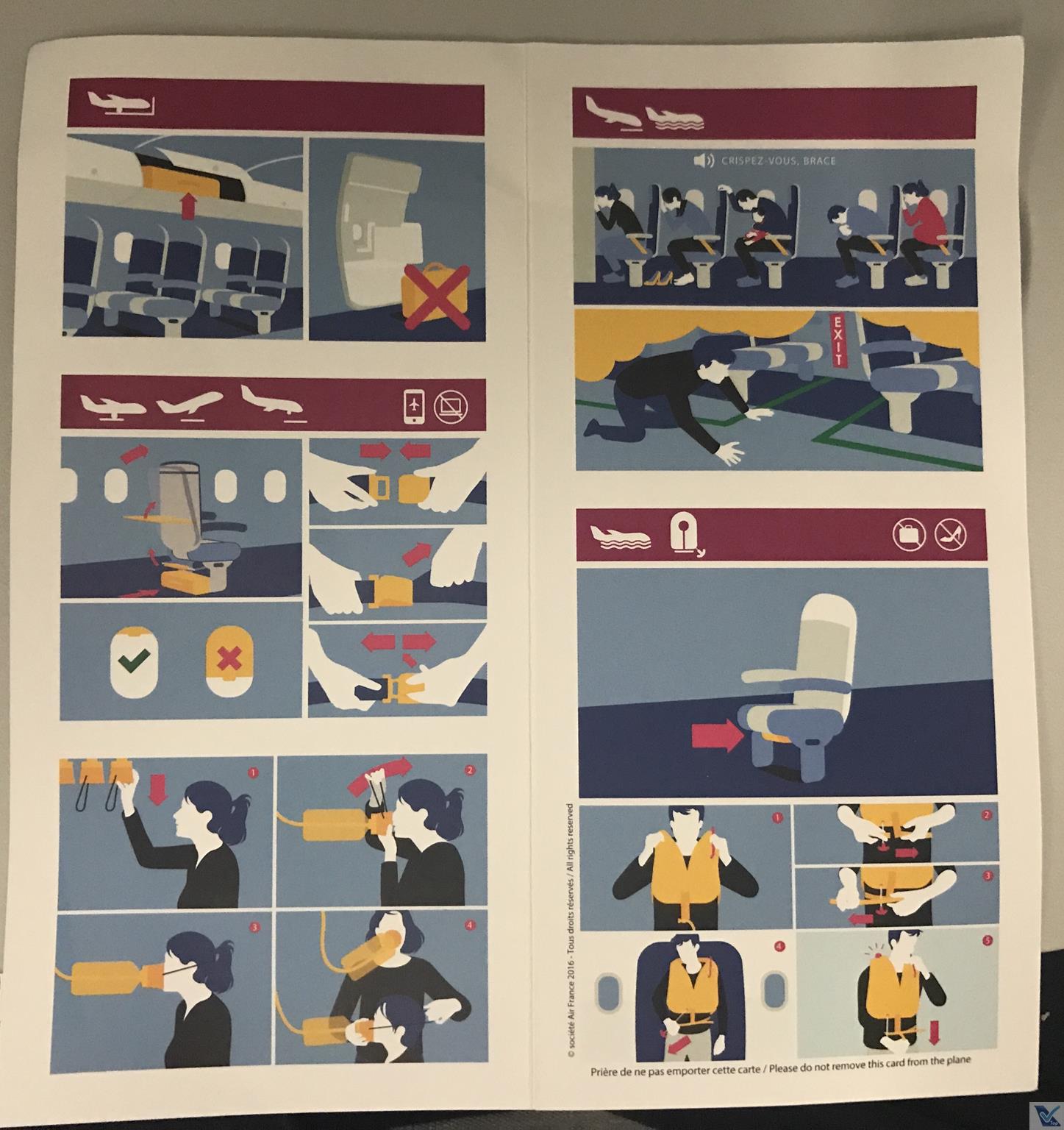 – no bolsão da poltrona da frente, a maior companhia francesa coloca a revista de bordo “Madame” (a única opção de entretenimento a bordo) e o cartão com as instruções de segurança