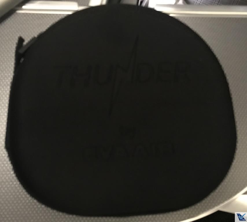 – o fone de ouvido oferecido pela EVA AIRWAYS era da marca Thunder e fica dentro de uma caixa preta, que por sua vez estava embalada em um plástico, indicando que tinha sido higienizado; o equipamento era muito eficiente e isolava muito bem o som exterior