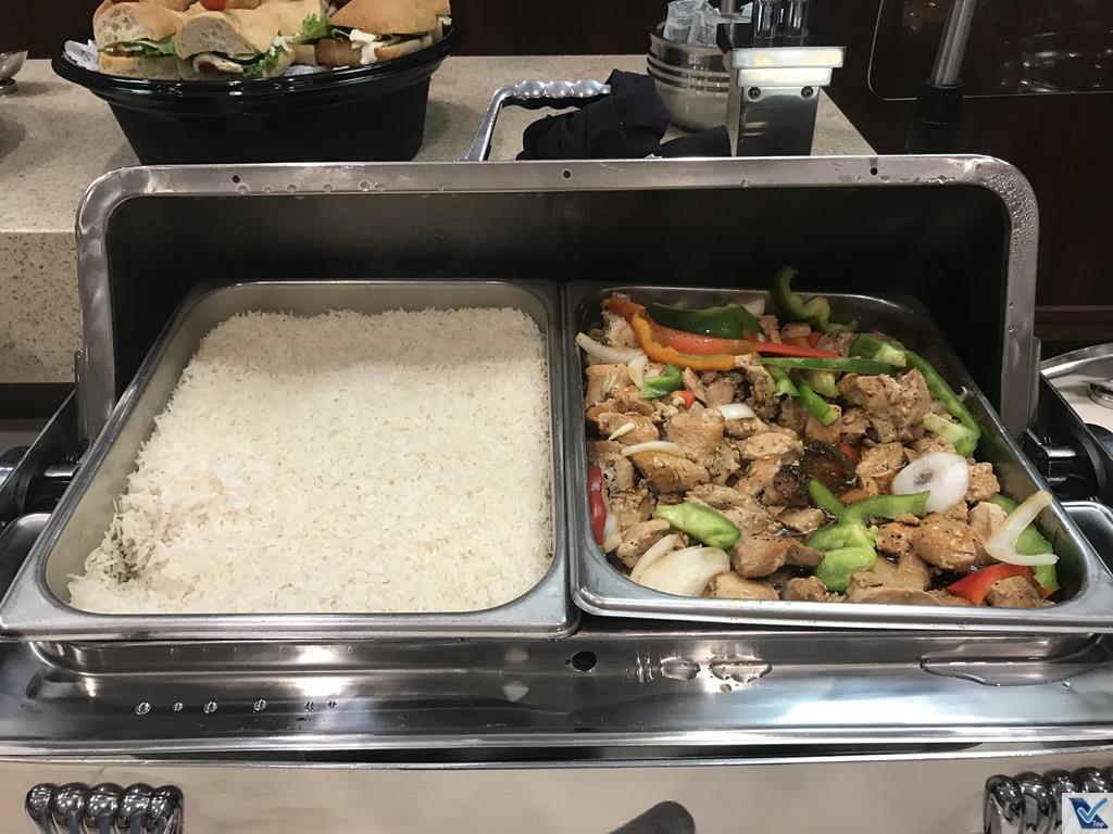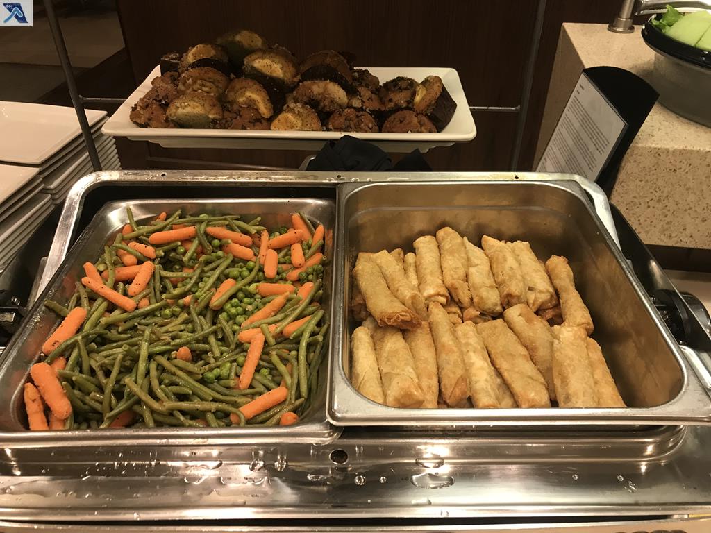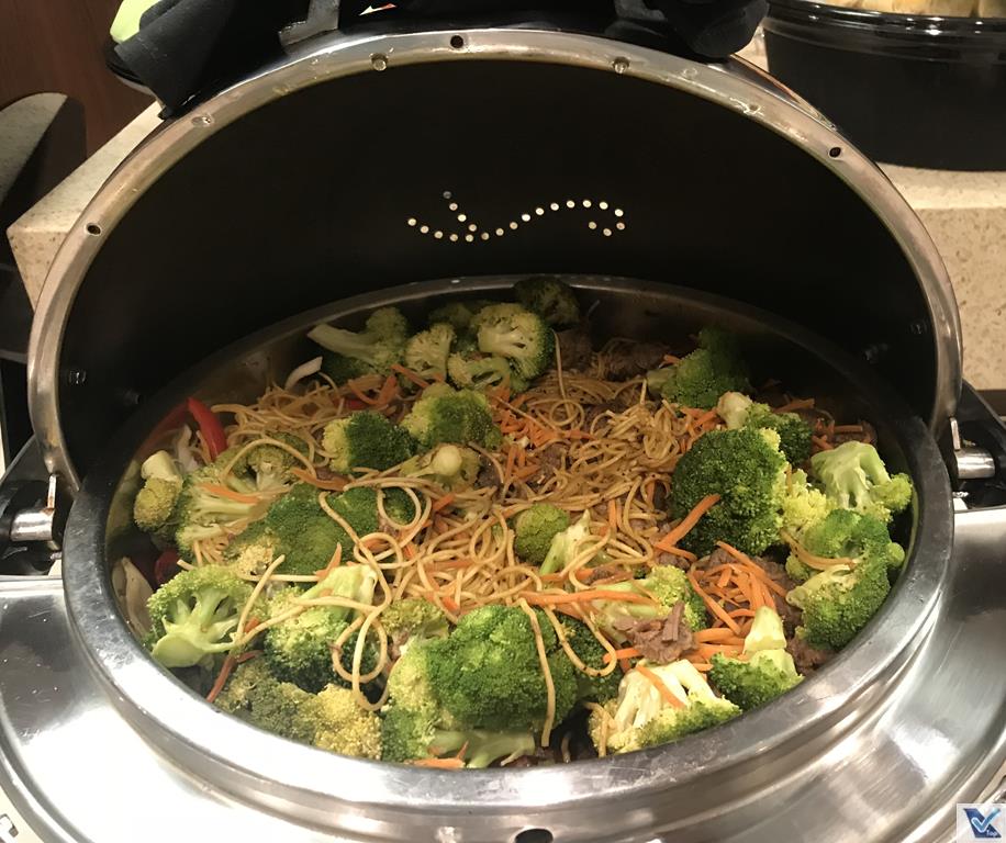 – o buffet servido naquele dia tinha grande variedade e oferecia boas opções de jantar: frango teriyaki, carne (beef Lo Mein), arroz (cozido no vapor), legumes e rolinho primavera de legumes, além de opções de sanduíches, queijos e saladas prontas (Caesar e Grega)