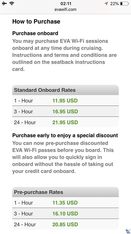 – a EVA AIRWAYS oferecia sistema de conectividade a bordo; mas quando acionei o Wi-Fi pelo celular, naveguei pelas opções e conferi os preços cobrados, achei muito caro (11,95 dólares por 01 hora ou 21,95 dólares por 24 horas) e desisti de ficar on line durante o voo; vale lembrar que eu tinha como referência o valor pago no dia anterior no voo da UNITED do Rio de Janeiro para Houston (9,99 dólares para o voo inteiro)