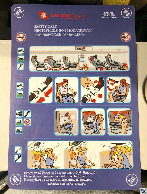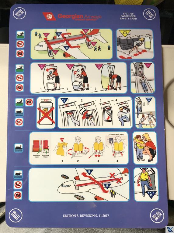 – no nicho instalado na parte traseira da poltrona da frente estavam disponíveis o cartão com as instruções de segurança e a revista de bordo “GA”, onde consta a lista de destinos que contam com voo regulares operados pela GEORGIAN AIRWAYS, com destaque para Paris, Londres, Praga e Barcelona