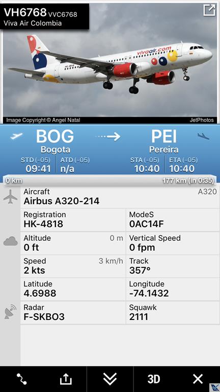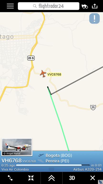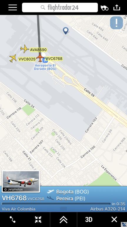 – eu fiquei acompanhando pelo Flight Radar a viagem da aeronave da VIVAAIR que me levaria até Bogotá; o voo VH6768 tinha partida prevista da capital colombiana às 09:41h, mas decolou depois das 10:10h